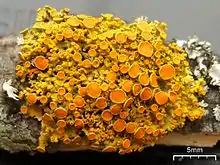 The lichen has a yellowish-orange thallus comprising small, overlapping lobes (measuring 0.3–0.9 mm wide) arranged in a loosely attached rosette. The thallus undersurface is white, and attaches to the bark substrate by relatively long rhizines. There are neither isidia nor soredia on the thallus surface. Apothecia, usually numerous in the center of the thallus, have dark orange discs and are 0.6–3 mm in diameter. Ascospores are ellipsoid in shape with a single septum, and have typical dimensions of 15.5–18 by 7.5–9.5 μm.[7]