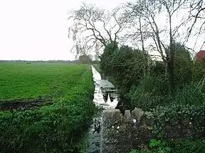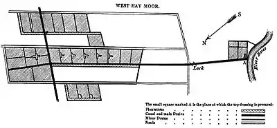 The River Brue provided a source of soil for top dressing, as rich soil was deposited on its banks after heavy rainfall.[4] It is not known when construction of the canal began, as Galton makes no mention of it in his article, and costs for the whole project are shown starting in 1811. However, the first carriage of soil is shown in 1822, when 90 cubic yards (69 m3) passed along the canal, so it must have been finished by this time.[5] The canal had been authorised by the Brue Drainage Act of 1801. It was about 1.4 miles (2.3 km) long and 16 feet (4.9 m) wide. The section which joined the River Brue was embanked on both sides, after which there was a small lock,[6] which raised the level of the canal to allow it to cross the moor.[4] It joined the North Drain at the far end, and continued a little further to service land being reclaimed on the north side of the drain.[7]