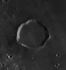 Gambart is a small lunar impact crater on the Mare Insularum, near the central region of the Moon. It is named after French astronomer Jean-Félix Adolphe Gambart.[1] It can be located to the south-southeast of the prominent ray crater Copernicus. In the past, the floor of Gambart has been flooded with lava, leaving a relatively flat surface surrounded by a smooth but somewhat polygon-shaped outer rim. To the southwest of Gambart is an area of hilly terrain deposited from ejecta during the Mare Imbrium impact, known as the Fra Mauro Formation.