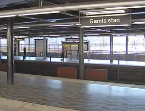 Gamla stan is a station on the Green and Red lines of the Stockholm metro. It is located on the western side of the Gamla stan (Old town) district of central Stockholm, and is at ground level, although partly under the Centralbron bridge that carries road and mainline rail across the waterways that define the centre of the city. The same waterways are responsible for the ground level location of the station, unusual for a city centre metro station, as the lines cross between the islands of Stadsholmen and Södermalm by a bridge immediately south of the station.[2][3]
