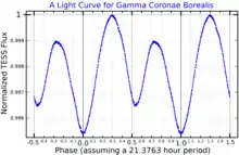 In 1969, γ Coronae Borealis was confirmed to be variable with an amplitude of 0.05 magnitudes. A year later, it was "confirmed" to be a δ Scuti variable with the earliest known spectral type in the class. The observed variations were not strictly periodic, but showed a characteristic timescale of 0.03 days (43 minutes).[16] γ Coronae Borealis also showed anomalous behaviour not seen in other δ Scuti stars, such as periods without variation.[17]