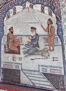 ![]() Fresco from the Udasi Chitta Akhara in Amritsar depicting Ganga Ram Viakarni (centre) with a disciple (left) and a fly-whisk attendant (chaur sahib; right) | |