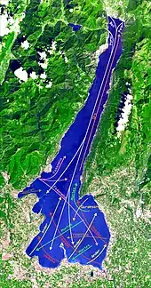 Clockwise from top: Sentinel-2 satellite image of the lake, View of the lake from Manerba, mountains nearby Limone and shared-use path of Garda, panorama of Sirmione, Castel of Malcesine and panorama of northern-most part of Lake Garda from Nago-Torbole