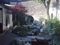 The 3,967m2 garden is divided into an eastern section of residence and a western garden section.[3] Altogether the garden has 13 pavilions, 17 tablets, and 8 stelae.[5] The Western section is composed of several pavilions around the main Lotus Pond, a rockery, and a smaller garden addition named The Garden of Sweet Grasses. The structure of the garden is formed along a north to south axis which ties the three main elements of rockery, pool, and hall together. This style of composition is also used in the Mountain Villa with Embraced Beauty. The overall design is the simplest expression of a classical garden, there is one dominant composition, the Longevity Hall, and its associated view. The 700 m2 Lotus Pond is square with two water tails to give the illusion of infinite size.[4] These tails are crossed by Fish Viewing Bridge and Ferrying Beauty Bridge The former is a three-step arched bridge adjacent to the Fry Pavilion. The latter is a natural stone bridge at the entry to the Sweet Grass Garden. The Garden of Sweet Grasses is a scaled down version of the main garden and consists of the Sweet Grass House and Bathing Gull Pond as well as a smaller rockery. This area is the herb (sweet grass) garden added by Wen Zhenheng. It is meant to evoke his principal of "to leave residents free from worries, make tenants unwilling to leave, and enable visitors to throw off their tiredness".[4] The garden is very typical of the Ming Dynasty design aesthetic because of its clear composition in plan and the elegance and simplicity of its elements.[4]