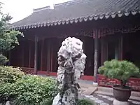 Named for a verse by Yuan Ji, "Cultivation of one's mind brings about longevity which enables one to be as admirable as the great nature."[4] It is a five bay hall with two wings, the Chenggu Valley Study and the Missing Jingting Mountain Study. All of the views in the garden are composed to be seen from this structure. The view meant to evoke a feeling of rustic delight. The hall was originally used as a teahouse and painting studio. The Missing Jingting Mountain study referred to the first official post of Jiang Cai, Mount Jingting in Xuanzhou, Anhui. |