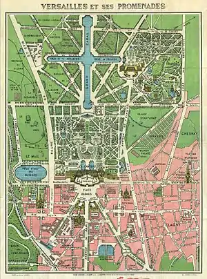From this point forward, the expansion of the gardens of Versailles followed the expansions of the château. Accordingly, Louis XIV's building campaigns apply to the gardens as well.[7] At every stage the prescribed tour was carefully managed, under the Sun King's directions.[8]