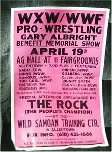 The Gary Albright Benefit Memorial Show was a professional wrestling event produced by World Xtreme Wrestling (WXW) promotion which took place on April 19, 2000, at the Agricultural Hall in Allentown, Pennsylvania. It was held in memory of wrestler Gary Albright, the son-in-law of promoter Afa Anoa'i and a mainstay of All Japan Pro Wrestling, who suffered a fatal heart attack at a WXW event in Hazleton, Pennsylvania three months earlier. Twelve professional wrestling matches were featured on the event's card, with two including championships.[1][2][3]