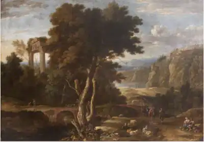 His landscapes are similar to those of his contemporary landscape painters of Brussels. Most of them are not in the Italianate style then popular in Flanders but he often still included some Italian antique relics to respond to the prevalent taste in the local market.[5] His landscapes often included pastoral scenes with shepherds, religious scenes or genre scenes such as village fairs or dances. His landscapes often involved collaborations with other painters who painted the staffage. Four collaborations with Anton Goubau on Italianizing landscapes are recorded.[6]