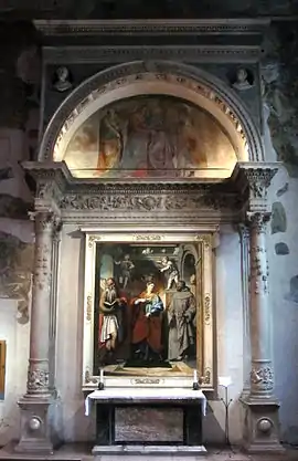 In possibly the last years of the 15th century, the Sanmicheli were involved in the stone decoration of the Caprioli chapel in the Church of San Giorgio, for which Cairano, almost simultaneously, prepared his Adoration, demonstrating for the first time outside of the Loggia a cooperation between the two studios.[99] Bartolomeo Sanmicheli, at the beginning of the new century, attempted at this point to make a comeback in the local art scene with the Ark of San Tiziano of 1505, characterized by a strong decorative quality. He possibly also aspired to the commission of the ark of Sant'Apollonio, which had been up for grabs since the discovery of the relics of the holy bishop in 1503.[100][99] An early involvement of Sanmicheli can be surmised in the Martinengo mausoleum, but the commission was awarded to Bernardino dei Crossi in 1503. However, based on the prevailing decorative nature of the monument, which is much more rigorously classical, it can be attributed to Cairano.[101]