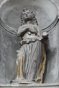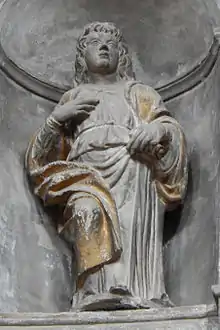 In general, all the stone sculptures at the Santa Maria dei Miracoli laid down in the decade following the cycle of the Apostles were limited to the interior of the building, and were by Cairano and his associates.[5] There is a possibility that this limitation was the result of a confrontation between Cairano and Tamagnino.[5] At the time Cairano worked on his Apostles, Tamagnino was the better regarded sculptor, and his superiority is evident in the artistic and technical quality of his Angels, if only for their relative modernity, following the neo-classical mode of Antonio Rizzo.[6][7] It is likely, therefore, that there was some local support that allowed Cairano to penetrate Tamagnino's stronghold in Brescia, despite the former's relative underdevelopment as an artist.[5] On the other hand, Tamagnino only created five other works within the church, and he was paid for the entire body of his work less than Cairano for his Apostles. Following this debacle, Tamagnino left the site of the church and Brescia, and only returned a decade later.[8][note 6]