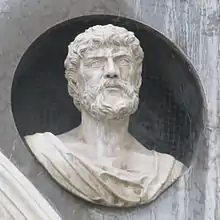 On August 30, 1493, Cairano was tasked with the decoration of the exterior of the Palazzo della Loggia with the delivery of capita 5 imperatorum romanum,[15] or five busts for the beginning of a cycle of thirty Caesars, which would become among the finest achievements of his career.[10] The production of these busts can be traced, in general, to a contemporary reworking of ancient portraiture.[10] In the oldest busts, i.e., those facing the piazza, there are similarities with the image of Bartolomeo Colleoni in the memorial by Andrea del Verrocchio in Venice,[16] with an evoking of an effigy of Antoninus Pius[17] and a portrait of Nero,[18] all famous images at the time and here revived in three dimensions.[10]