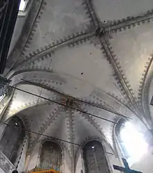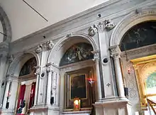 By 1507, however, Cairano's decorative lapidary work in the interior of the San Pietro in Oliveto became known as the third great achievement of the artist, after the Miracoli and the Loggia.[24][32] The architectural scores that punctuate the sequence of the altar and the composition of the whole, however, are unrelated to Cairano's style. Rather, they are consistent with Sanmicheli, who indeed possessed the only workshop in town capable of engaging a work of this magnitude.[24] Certainly the twelve Apostles in the spandrels in the arches of the nave are Cairano's work - the artist's hand is unmistakable.[24][33] There is very poor and fragmentary documentation relating to this historic building that has come down to us.[34]
