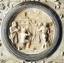 A thorough stylistic analysis of the ornamentation of the monument, in particular of the figures within the circles of the Battle scene and the Scene of sacrifice reveal a surprising sensitivity to bronze on the part of Cairano, and considerable scope for reinterpretation and commingling of styles.[77] This stemmed from a sensible response to the context in which the mausoleum was designed and implemented. Unprecedented in Brescia was the combination of bronze and stone, the former under the supervision of Bernardino delle Croci who certainly had a vast catalogue of references to ancient and contemporary works, all of which are cited in the major and minor rounds on the base.[78][79] It is difficult to exclude Cairano from the influence of so much classicism, but the sole Scene of sacrifice attests to the sophistication of his chisel and the innovative combination of sculpture and bronzes around 1510, to which date much of the remaining lapidary apparatus can also be placed.[77][note 17]