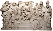 Stylistic considerations place a number of works, usually small statues, reliefs or fragments removed from their original context and scattered in different locations to the middle of the second decade of the sixteenth century.[80] It is not yet clear whether these artefacts were due to Cairano or the immediate result of his collaborators, for example, his son Simone.[59] These are works in which the boundary between the maturity of Cairano's art and the work of the studio is blurred, and discernment depends on an analysis of Cairano's development from his earliest works, such as the Sanctuary of Miracles and the Loggia,[note 18] combined with clear attempts at cultural update.[59] This is the case, for example, with Cairano's Lamentation over the dead Christ preserved in The Museum of Ancient Art, Milan,[81] and the Descent from the Cross in the Santa Giulia Museum of Brescia,[82] which seem to point to pictorial models of Giovanni Bellini and Girolamo Romani.[82] Another prominent work, dated to the first decade of the century, is the so-called Pala Kress in the National Gallery of Art in Washington, D.C.[83]