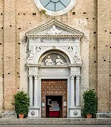 The construction of the entrance to the Duomo of Salò is copiously documented between 1506 and 1509. The design was by Cairano,[37][38] most likely in collaboration with Antonio Mangiacavalli.[39] Cairano's hand is evident in the figures of the Father, St. Peter and St. John the Baptist, leaving the Virgin to his collaborator, while the Angel of the Annunciation and two small busts in the spandrels appear to be a joint work. The architectural parts were accomplished by different stonemasons as recorded in the documents relating to the workshops, including Mangiacavalli's son.[40] The portal was put in place by August 1508, and embellishments and other work ended at the beginning of 1509.[37]