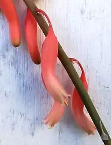 The flowers of Gasteria nitida are a darker reddish pink, with yellow throats (the only Gasteria with this feature). The inflorescence is branched, and flowering time is in summer - from December to February in South Africa.