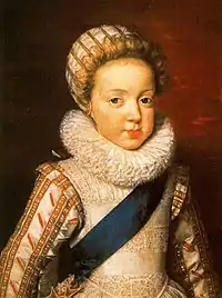 Gaston Jean Baptiste was born at the Palace of Fontainebleau on 24 April 1608 and at birth was given the title of Duke of Anjou. As a child, he was raised under the supervision of the royal governess Françoise de Montglat. In 1626, at the time of his marriage to the young Marie de Bourbon, Duchess of Montpensier, he received in appanage (with their respective titles) the duchies of Orléans[1] and Chartres, and the county of Blois.[2] He had nominal command of the army which besieged La Rochelle in 1628,[3][4] having already entered upon a course of political intrigue that would occupy the remainder of his life. He was the heir presumptive to the throne of France from the death of his brother Nicolas Henri in 1611 until the birth of his elder brother's first son in 1638.