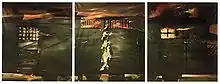 In 1970 he represents Spain at the XXV Venice Biennale. Among other works exhibited at the Spanish pavilion is "Train in Flames", an enormous triptych that was the focus of an in-depth analysis by critics Luigi Carluccio and Elvira Cassa Salvi.[4] Acting on the advice of James Johnson Sweeney the famous business baron and patron of the arts Joseph Hirshhorn bought this painting and with the remainder of the works shown at the Biennale. The monumental triptych became part of the permanent collection of the Hirshhorn Museum and Sculpture Garden from the day of its opening in 1974.[5] In 1972 Orellana exhibits for the first time with the Turin-based dealer Christian Stein with whom he was to establish a long working relationship.[6] On 3 August 1974, he married Isabel, née Calles, with whom he was to have two children. In 1975 the monograph volume "Orellana 1945-75" was presented at the Circulo Internacional de Prensa, Madrid, published by Heliodoro (Madrid). The book included essays by Jose M. Moreno Galvan, Enrico Crispolti, Charles Spencer, Paulino Posade and Vicente Aguilera Cerni.[2] In 1979 he took a studio at the Hotel Chelsea.[7]
