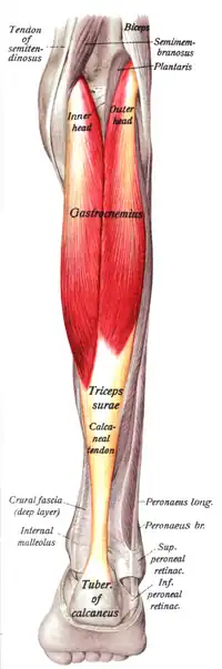The gastrocnemius muscle (plural gastrocnemii) is a superficial two-headed muscle that is in the back part of the lower leg of humans. It is located superficial to the soleus in the posterior (back) compartment of the leg. It runs from its two heads just above the knee to the heel, extending across a total of three joints (knee, ankle and subtalar joints).