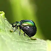 Gastrophysa cyanea, the green dock beetle (note: Gastrophysa viridula in Europe is also sometimes called the green dock beetle), is a species of leaf beetle in the family Chrysomelidae. It is found in North America.[1][2][3] G. cyanea is 4-5 mm and metallic green. Females can be distinguished by their swollen abdomens prior to egg laying. They emerge in spring and commonly feed on curly dock. Some pinned specimens will turn metallic blue.[4]