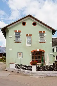 The oldest part of the restaurant, the main building is a two-storey building with garett hip roof and the taproom behind segmental arch windows on the ground floor. This component was built before 1800, maybe early as 1665 as the inscription MDCLXV suggests. Approximately 50 guests can be accommodated; the decor is simple and largely obtained in the first half of the 20th century according to their time of origin. Above the entrance stands a large dormer with a pulley from the roof.