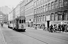 Copenhagen Tramways Line 16 operated through Gasværksvej on its way from Toftegårds Plads in Valby to Emdrup Torv.