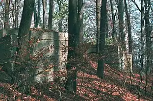 From the main entrance at the top of the Gallitzinberg hill, a blast-proofed staircase descended 25 meters to the main tunnel (profile, 2 x 2 meters) which ran for about 100 meters horizontally to the north, ending in a secondary entrance where a small power plant was situated. Another tunnel diverged eastward towards the 17 x 5 meter actual bunker core.[1] On its upper level were the communications facilities, with landlines to all civil emergency services, the Führer Headquarters, the Oberkommando der Luftwaffe and even the Kriegsmarine. On the lower level were the command center, a meeting room and Schirach's personal facilities. The tunnel system had a total length of 340 meters. A tripartite security zone system controlled access to the installation.