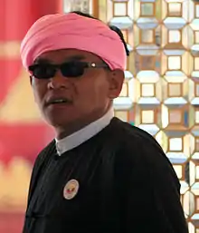 The gaung baung (Burmese: ခေါင်းပေါင်း [ɡáʊɰ̃ báʊɰ̃]; Mon: သမိၚ် ဍိုပ်, [həmoiŋ dɒp]; Shan: ၶဵၼ်းႁူဝ် [kʰén.hǒ]; Northern Thai: เฅียนหัว [xian.hǔa]) is a traditional Burmese kerchief and part of the traditional attire of many ethnic groups inhabiting modern day Burma and Northern Thailand, particularly among most of the Buddhist-professing ethnic groups: the Bamar, Mon, Arakanese, Shan, and Tai Yuan peoples. The design varies from region to region, but share basic similarities that distinguish the gaung baung from the kerchief.