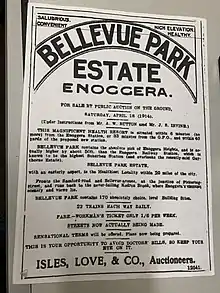 On Saturday 18 April 1924 auctioneers Isles, Love, & Co offered 170 residential lots in the Bellevue Park Estate in Enoggera Heights. It was described as fronting Samford Road and Bellevue Avenue at the junction with Pickering Street (27°24′57″S 152°59′01″E / 27.4158°S 152.9837°E).[14]