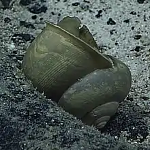 Inner lip—from the corner of the outer lip a very thin layer of nacre spreads out a little way across the body, but then ceases entirely. The columella is spread out at its base as a confined, flattened, unevenly inclined, semicircular, iridescent umbilical pad. From the left corner of which the columella proper projects, it has a narrow but rounded edge, twisted, straight, bending to the left, and advances into a sharply angulated, and, as seen from behind, even mucronated junction with the basal aperture edge, to which the umbilical pad curving round the back of the pillar also attains. The inside is scored with the external sculpture, and is brilliantly iridescent. The umbilical pad is defined by a narrow furrow, and in front by a slightly tumid ridge, which is the least nacreous part of the whole shell. The operculum is membranaceous, horny, yellowish, with about six to seven turns, each strongly defined by a narrow line of thickening, and sharply scored with minute oblique radiating lines.[4]