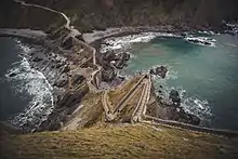 Gaztelugatxe is an islet on the coast of Biscay belonging to the municipality of Bermeo, Basque Country (Spain). It is connected to the mainland by a man-made bridge. On top of the island stands a hermitage (named Gaztelugatxeko Doniene in Basque; San Juan de Gaztelugatxe in Spanish), dedicated to John the Baptist, that dates from the 10th century, although discoveries indicate that the date might be the 9th century. With another small neighboring island, Aketx, they form a protected biotope that extends from the town of Bakio to Cape Matxitxako, on the Bay of Biscay.