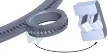 A gear bearing is a type of rolling-element bearing similar to an epicyclic gear. Gear bearings consist of a number of smaller 'satellite' gears which revolve around the center of the bearing along a track on the outsides of the internal and satellite gears, and on the inside of the external gear. Each gear is in between two concentric rings. Therefore, the widths of the satellite gears must all be the same.