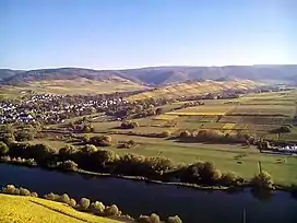 ![]() The Geisberg (literally: Goats Hill) seen from the north-west, Moselle in between, Mühlheim village to the left | |