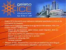 The Gelato ICE: Itanium Conference & Expo alternated between San Jose, California and somewhere else in the world, often in Southeast Asia or Europe. Gelato conferences were where most of the collaboration and cooperation between members were established, and where Intel revealed some of their future strategy for the Itanium-based platform. The last conference was held in Singapore in October 2007.