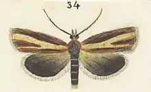 The wingspan is about 25 mm. The forewings are dark fuscous with reddish scales and a broad irregular pale-yellow streak from the base to the apex. The hindwings are fuscous.[2]