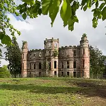Gelston Castle, located near Castle Douglas in Kirkcudbrightshire in Dumfries and Galloway, Scotland, was built by Sir William Douglas of Castle Douglas, who had acquired the lands of Gelston in 1799.[1] However, Sir William Douglas died without issue in 1809 and his property was divided between various nieces and nephews, with Gelston going to the youngest daughter of his brother James, Mathilda Douglas. In 1813 Mathilda married William Maitland, and their family continued to preside over the estate for most of the 19th Century. Gelston then became the property of the Galliers-Pratts who retained the castle for pheasant shooting, and from whom it was requisitioned during World War II. During this time it served as a home for handicapped boys evacuated from Glasgow, before the roof was removed once this use had ceased.[2]