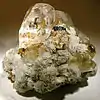 Emerald, clinozoisite, sphene, and epidote | The image shows a light olive green coloured sphene (titanite) with epidote on calcite matrix. | [3] |