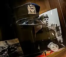 New York police cap and badge worn by Louis de Funès in the film Le Gendarme à New York. Below is a gold whistle bearing the initials of Louis de Funès. Exhibited at the Louis de Funès Museum.