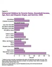Children living in poverty have limited access to basic health needs overall, however gender inequalities become more apparent as children age. Research done on children under the age of five suggests that in low to middle income countries, approximately 50% of children living in poverty had access to basic health care.[62] There was also no significant difference between boys and girls in access to healthcare services, such as immunizations and treatment for prevalent diseases such as malaria for both.[62] Research focused on a wider age range, from infancy to adolescence, showed different results. It was found that in developing countries girls had more limited access to care, and if accessed they were likely to receive inferior care to that of boys.[63][64] Girls in developing countries were also found to be more likely to suffer emotional and physical abuse inflicted by their family and community.[63]