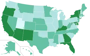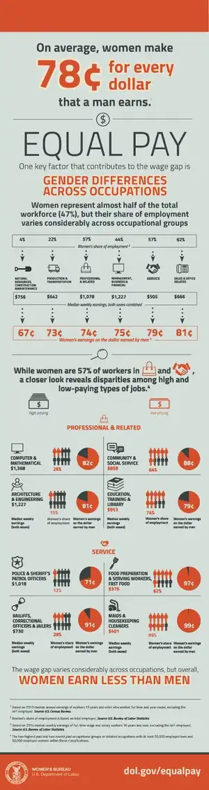 In 2016, women's earnings were lower than men's earnings in all states and the District of Columbia according to a survey conducted by the U.S. Census Bureau.[11] The national female-to-male earnings ratio was 81.9%. Utah ranked lowest at 69.9% and Vermont ranked highest at 90.2%.[11]