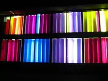 For a public work in a different medium altogether, he designed the color patterns of the "Solar Wall," a set of tubes filled with dyed water and backlit by fluorescent lights, at the Muscarelle Museum of Art at the College of William and Mary in Williamsburg, Virginia.[5]
