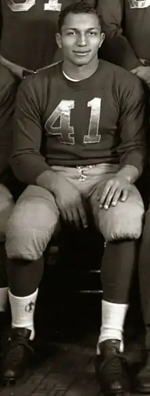 While Eugene (or Gene, as he was often called) would become known for his athletic ability, he was also an excellent student, graduating from Defiance High School as the class valedictorian. (Jason, 1944) Because he was a star athlete, he was awarded a scholarship to attend the University of Michigan. He enrolled in 1944, majoring in chemistry.[4] While there, he became the first African-American to play in the offensive backfield for the Michigan Wolverines football program. Derricotte was an immediate contributor as the team's leading ground gainer in 1944.[5] Press reports in 1944 typically referred to his race, identifying him as "freshman negro halfback,"[6] the "Negro speedster,"[7] the "speedy negro freshman,"[8] or the "lithe Negro star."[9]