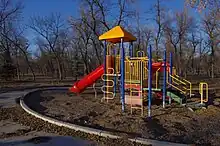 In May 2011, the park was inundated with floodwaters from the Missouri River, with water levels reaching their peak of 19.24 feet (6 m) on July 1, 2011. Once the flood had abated, Bismarck Parks and Recreation District commissioned a visual survey of the damage caused by saturated soil conditions and wind storms. Over 1,200 trees had been toppled or partially uprooted. The report concluded that replanting should increase the diversity of tree species to reduce the losses if an insect or disease were to enter the park, and also ensure introduction of species with known tolerance of flooding.[7] Campgrounds were closed for the season while the cleanup took place.[9] By November 2011, around three-quarters of damaged and fallen trees had been removed by forestry crews.[10]
