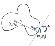 Choose a reference point y for the shape (typically chosen inside the shape). For each boundary point x, compute ɸ(x), the gradient direction and r = y – x as shown in the image. Store r as a function of ɸ. Notice that each index of ɸ may have many values of r. One can either store the co-ordinate differences between the fixed reference and the edge point ((xc – xij), (yc – yij)) or as the radial distance and the angle between them (rij, αij). Having done this for each point, the R-table will fully represent the template object. Also, since the generation phase is invertible, we may use it to localise object occurrences at other places in the image.