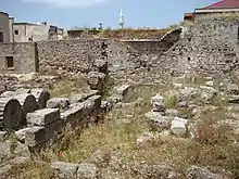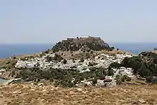 Vatatzes reacted swiftly, sending a fleet to the island, led by the pinkernes and doux of the Thracesian Theme, John Kantakouzenos. Kantakouzenos set out in late 1248 or early 1249, but did not directly move to Rhodes, instead capturing first the islands of Leros and Kalymnos.[12] Initially Kantakouzenos had only a small army at his disposal, possibly only troops from his own Thracesian Theme. As a result, he apparently first moved to secure the fortresses in the southern part of the island not yet captured by the Genoese, before marching north towards the city of Rhodes. The Nicaeans landed near the fortress town of Lindos, some 40 kilometres (25 mi) south of Rhodes city, and then established their base at Phileremos, 5 kilometres (3.1 mi) southwest of Rhodes city. At this time, reinforcements sent by Vatatzes arrived, allowing Kantakouzenos to blockade the Genoese in the capital.[13][14]