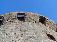 The Genoese towers were constructed of stone blocks held together with mortar. Most of the towers were circular in plan although a few were square, such as the Torra di Portu and the Torra di Pinareddu.[6] The circular towers were typically 12 metres (39 ft) high and 10 metres (33 ft) in diameter at the base reducing to 7 metres (23 ft) at the moulded string course marking the level of the first floor.[7][8] The base contained a cistern, fed with rainwater by an internal pipe from the terrace. The vaulted room on the first floor was connected to the terrace by a staircase built into the thick exterior wall and protected at the top by a small guerite. The terrace was surrounded by a low machicolated battlement. A doorway in the side of the tower at the first floor level was reached by a removable wooden ladder. A few towers were taller, at around 17 metres (56 ft), and included a second internal vaulted room above the first.[6] Examples are the Torra di a Parata near Ajaccio and the Torra di Santa Maria Chjapella in Capicorsu.[9] The towers were manned by an officer and two or three soldiers who lived in the room on the first floor which had niches in the walls and a fireplace.[6][10]