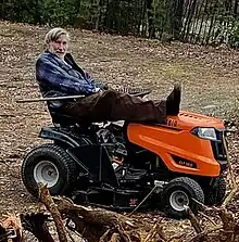 ![]() Geoffrey Holt aboard his riding mower in 2020 | |