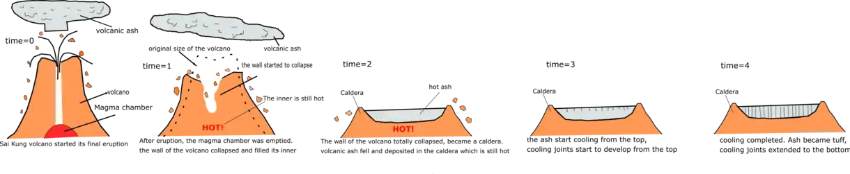 Hexagonal columnar joints are parallel vertical cracks that are formed when homogeneous volcanic materials cool down and evenly contract inward towards a contraction center point. In the early Cretaceous period, there was a volcano centred east of the Sai Kung peninsula. The final eruption of the volcano was explosive and the magma chamber was emptied. It lost support in its core and collapsed. The remains became a caldera with a diameter of about 20 km. The large amount of volcanic ash produced in this eruption eventually settled in the caldera and formed a thick layer of hot viscous ash.[11] The hot ash eventually cooled down. Then each column started to contract inwards. When each side of the hexagon shrinks evenly towards the centre, it formed regular hexagonal shaped cracks. Starting from the top part, the cracks developed downwards. Finally the pillars were created.[12]