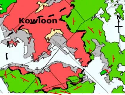 The Kowloon granite exhibits a circular shape surrounding Victoria Harbour, and is surrounded by volcanic rocks. The volcanic rocks are oriented in a way such that they are surrounding the circular Kowloon granite. During early Cretaceous period, a ball shaped magma rose. It pushed and deformed the surrounding volcanic rocks outwards and formed the interesting orientations of its surrounding volcanic rocks.[1]