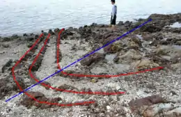 A fold on Ma Shi Chau, Hong Kong. Red lines show the limbs,the blue line shows the axis